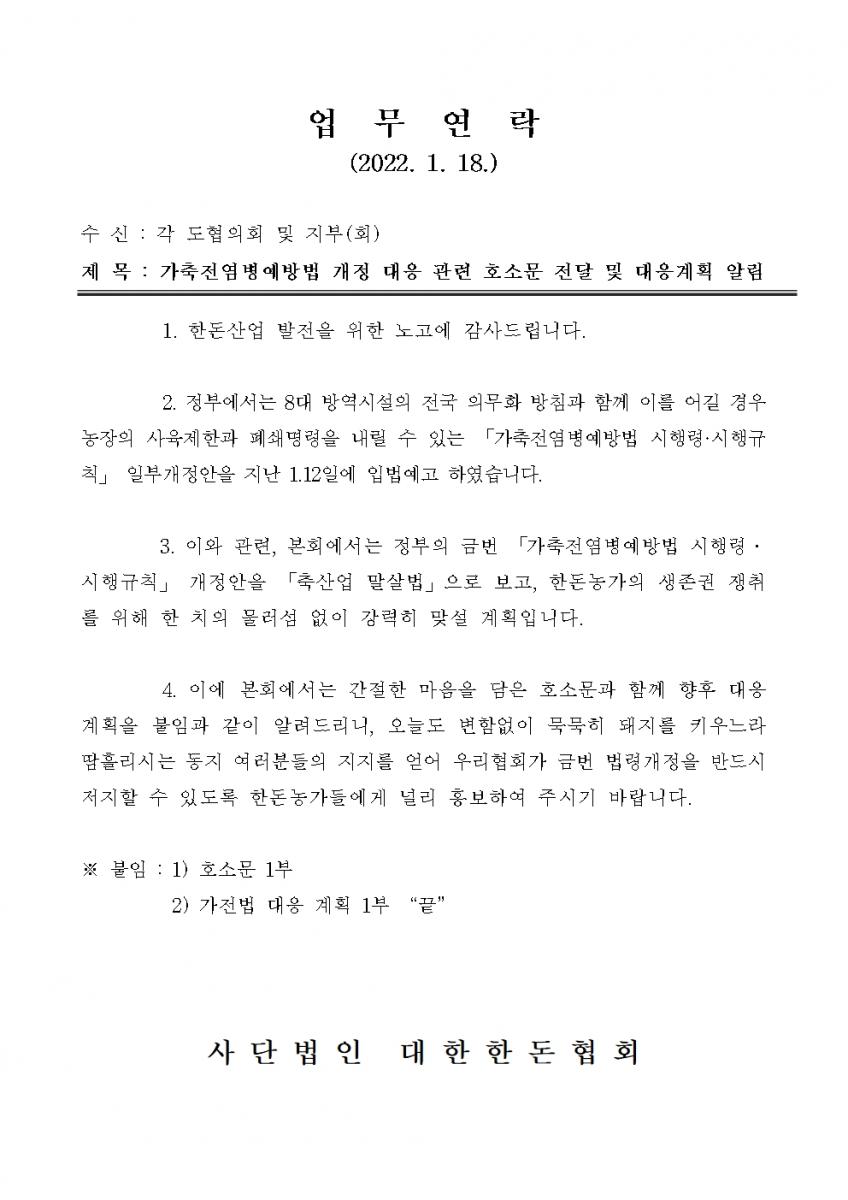 첨부파일 다운로드 (0118)업무연락_가축전염병예방법 개정 대응 활동사항 안내.pdf