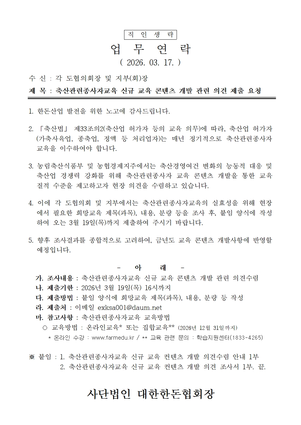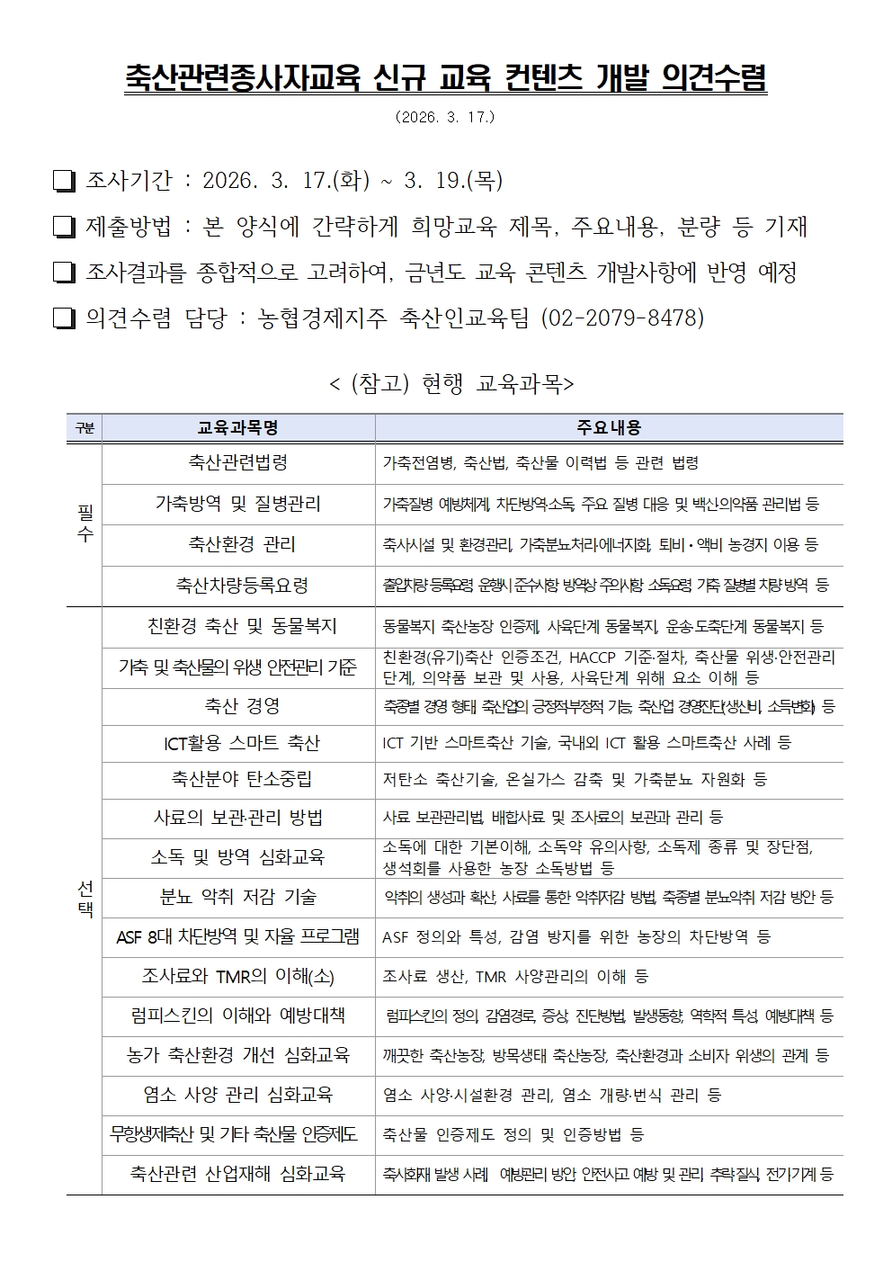 첨부파일 다운로드 (업무연락_260317)(붙임1) 축산관련종사자교육 신규 교육 컨텐츠 개발 의견수렴 안내.hwp