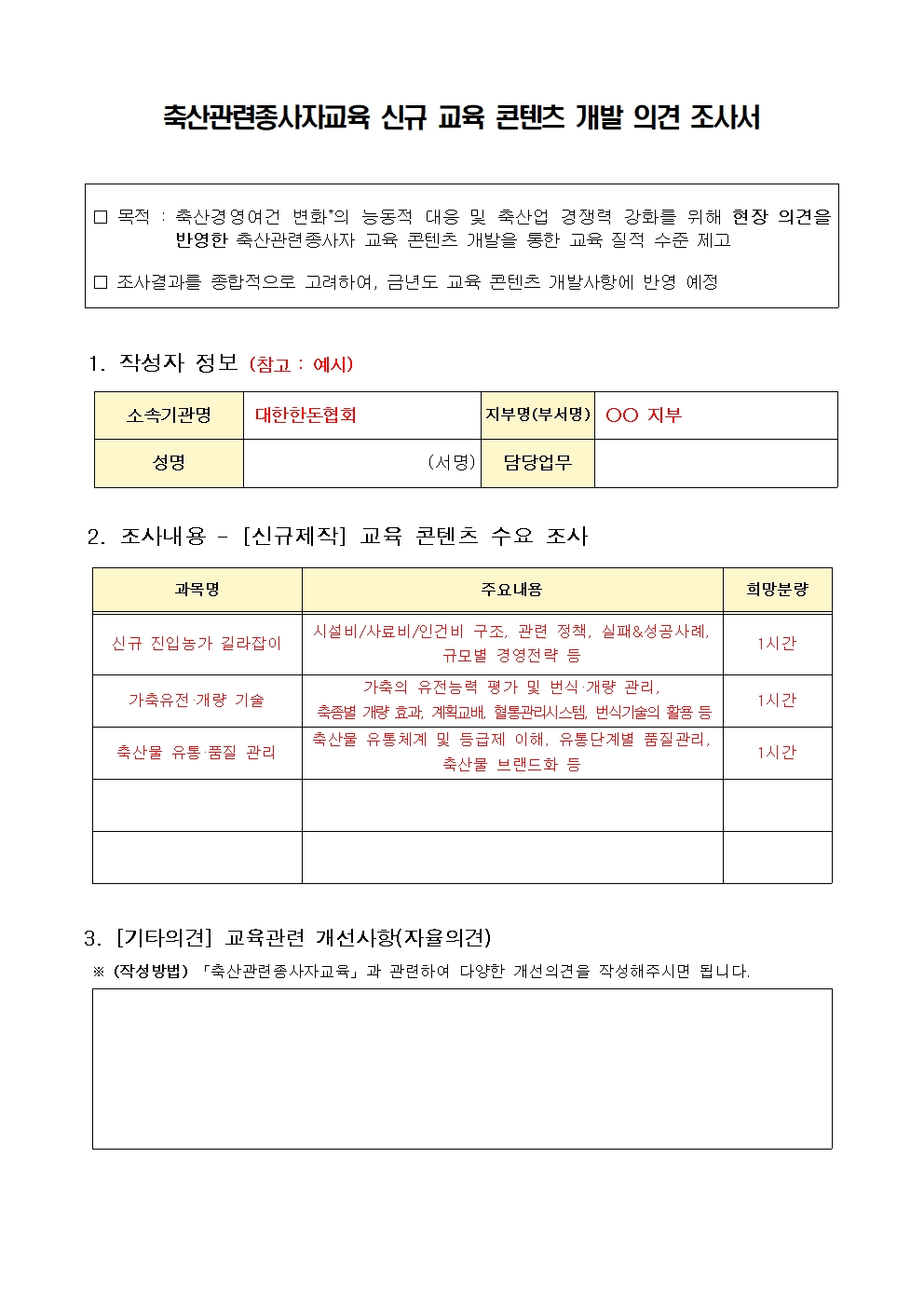 첨부파일 다운로드 (업무연락_260317)(붙임2) 축산관련종사자교육 신규 교육 컨텐츠 개발 의견 조사서.hwp