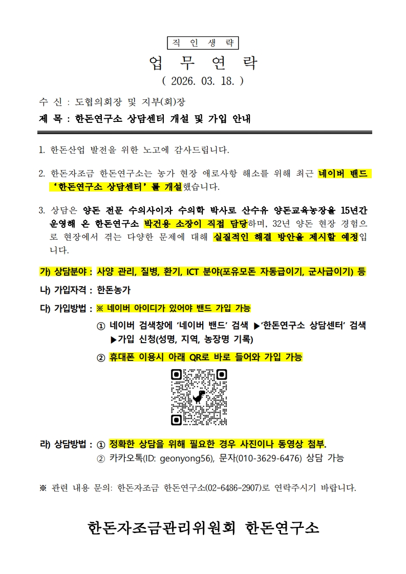 첨부파일 다운로드 (업무연락) 20260318_한돈연구소 상담센터 네이버 밴드 가입 안내.pdf