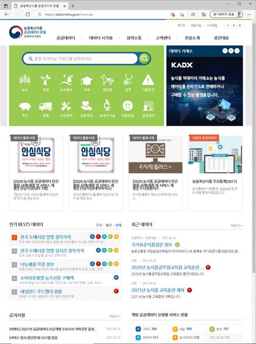 ■ 농식품 공공데이터 포털(data.mafra.go.kr) 화면 ![]() [출처: 농림축산식품부 보도자료 2021. 7. 9.] |