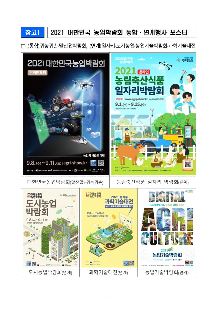 - ‘농업의 새로운 미래’를 주제로, 온라인 종합박람회 개최 - << 주 요 내 용 >> ◈ 행 사 명 : 2021 대한민국 농업박람회 * 통합 : 귀농귀촌·말산업박람회, 연계 : 일자리·도시농업·농업기술박람회·과학기술대전 등 ◈ 기 간 : 2021. 9. 8.(수) ~ 11.(토) 4일간 ◈ 진행방식 : 온라인(누리집 agri-show.kr, 유튜브 등) ◈ 주최·주관 : 농림축산식품부, 농림수산식품교육문화정보원 등 ◈ 주요행사 및 프로그램 ○ (개막) 2021. 9. 8.(수) 11:00, 장관 환영사, 미래기술 특별세션* * 미국 마이크로소프트 등 세계적인 스마트 농업 전문가들이 참여하여 농업기술의 현주소와 미래 발전 전략 등을 사례와 함께 대담 ○ (언팩쇼) 농업로봇, 푸드테크, 그린바이오 등 농업 최신기술 소개 ○ (영상기획전) 식량안보, 사회적농업, 농촌융복합산업 우수사례, 농촌체험, 농업기술·농식품 트렌드 등 ○ (컨퍼런스·토크쇼) 농촌재생, 그린뉴딜, 귀농귀촌, 말산업 등 ○ (1:1 상담) 농식품 관련 기업 채용상담, 창업컨설팅, 귀농 멘토링 등 ○ (기획판매전) 농식품 판매기획(농협몰·축협몰), 대한민국 햅쌀(네이버 라이브) << 세 부 내 용 >>