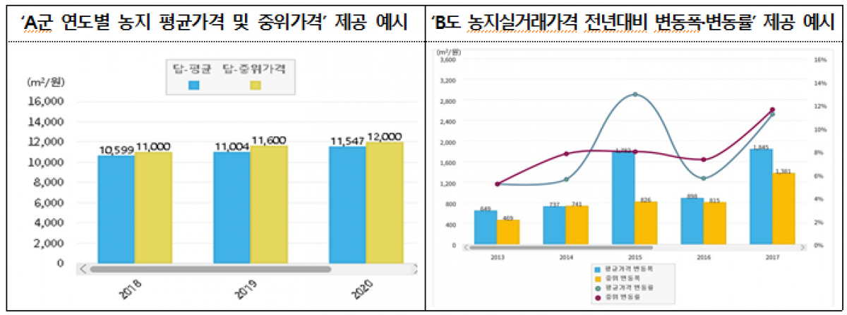 - 「농지은행포털」, 지역별 농지가격·임차료 정보제공 서비스 실시 - << 주 요 내 용 >> □ 농지가격·임차료 정보제공 ○ (목적) 농지 정보제공 범위 확대*로 농업인의 농지정보 접근성 강화, 거래 투명성 제고, 신규 농업인의 영농 정착 활성화 등 도모 * (기존) 필지별 농지가격 및 거래량 단순 제공 → (변경) 기존정보 + 가격·임차료 정보를 유형별로 분석 제공 ○ (제공일) 2021년 12월 16일(목) ~ ○ (제공방식) 농지은행포털 누리집(www.fbo.or.kr)을 통한 제공 * 누리집 → 농지동향 → 가격·임차료현황, 농지가격정보, 농지임차료정보 ○ (제공내용) 지역(시·군)별로 필지별 농지가격·임차료 정보뿐만 아니라, 지목(전·답·과) 및 농업진흥지역 안·밖 등으로 구분하여 평균가격, 중위가격, 변동률 등 통계정보 제공 ![]() << 세 부 내 용 >>