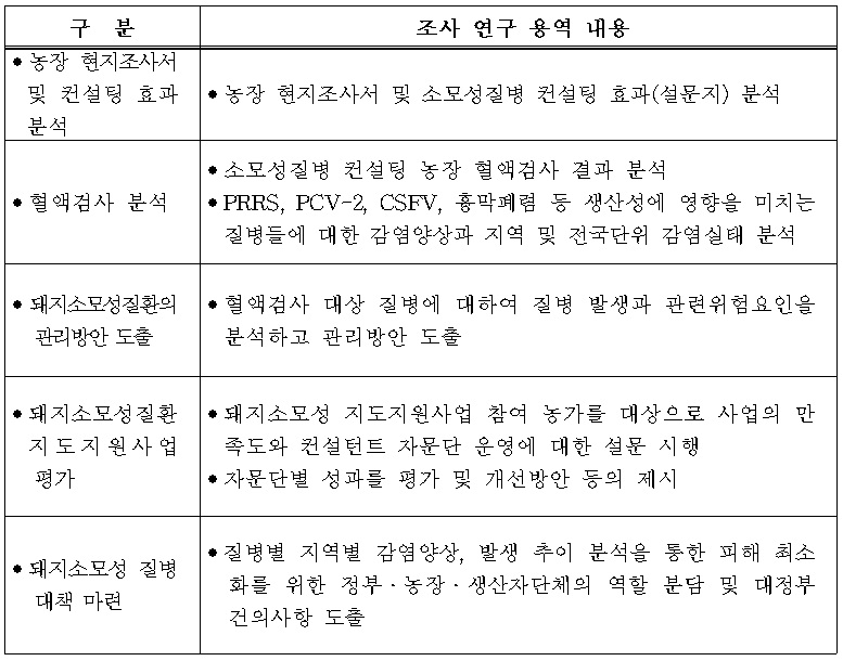 <입찰 공고번호: 한돈협지 제351-4-1호> 2012년도 전국 양돈장 질병실태조사 연구 용역 1. 연구용역의 배경 및 목적 가. 농림수산식품부에서 추진한 2012년도 돼지소모성질환 지도지원사업에 의거 전국 350개 양돈장 및 종돈장에 대한 종합 컨설팅 및 주요 질병에 대한 실험실 검사를 진행하였음. 나. 소모성질환 컨설팅 지원대상 농장에 대한 컨설팅 결과 및 현지조사내용, 주요질병 검사내용을 종합적으로 분석하여, 질병실태를 파악하고, 전국단위의 효과적인 질병 관리방법을 모색해 양돈농가의 경제적 손실예방 및 경쟁력 제고. 다. 주요 질병에 대한 방역대책 수립에 기초 자료로 활용. 2. 조사연구 용역 내용 가. 조사연구명 : 2012년도 전국 양돈장 질병 실태조사 나. 조사 내용 ![]() 다. 조사 대상 : 350농가(‘12년도 돼지소모성지도지원사업 대상농가) 마. 질병 검사내용: 10종 - 검진두수 : 46두/농장, 년2회, 총32,200두 채혈은 검사기관에서 실시함 - 검진대상질병(10종) : 돼지열병, PRRS, PCV-2, 유행성폐렴, 흉막폐렴, 글래서병, 파스튜렐라폐렴, 위축성비염, 살모넬라병, 구제역(항체가포함). 바. 연구비 한도 : 1) 39,000천원(제세공과금 포함)으로 하되, 조사연구 제안업체에서 제안하는 내용에 따라 연구비를 감액하여 제시할 수 있으며, 제안내용과 연구비 등을 복합적으로 심사하여 계약 우선순위업체를 정함 2) 업체 수행기관의 간접비는 5% 이내로 하여야 함. 사. 연구 기간 : 계약기간으로부터 3개월 이내 3. 조사 진행방법 선정된 조사연구 업체(기관)에 조사연구 용역수행을 위하여 검역검사본부와 협회에서는 기초자료를 제공함. 4. 신청 자격 가. 교육법에 의한 대학 또는 전문대학 나. 정부 출연 연구기관 및 기업부설연구소 다. 기타 법인 연구기관 및 위와 동등한 자격을 갖춘 기관 등 ※ 두 개 이상의 연구기관이 컨소시엄을 구성하여 지원할 수 있으며 이 경우 주관연구기관을 명시하여야 함 5. 신청 방법 및 접수 마감 가. 신청방법 : 요청 양식에 따라 한돈자조금 조사연구사업 계획서 제출 나. 접수마감 : 2013. 3. 21(목) 16:00시 도착분까지 다. 접수방법 : ❍ 직접(우편)접수 : 서울시 서초구 서초1동 1621-19 제2축산회관 3층 대한한돈협회 정책기획부 ❍ E-mail 접수 : exksa@hanmail.net 6. 제출 서류 가. 연구사업 계획서 1부(별첨 양식) 나. 연구 제안서 8부(심사용, 예산서 합본, 별첨양식을 참조하여 작성․제출) 다. 기관 소개서(현황 및 연혁, 유사사업 실적-최근 3년간) 라. 법인등기부등본 1부(해당시) 마. 사업자등록증 사본 1부(해당시) 7. 선정방법 가. 본회가 구성한 심사위원회에서 심사 나. 심사위원회에서 평가를 실시하여 고득점자순으로 우선 협상 대상자로 선정하여 협상에 의한 계약 다. 심사일 : 접수결과에 따라 심사일 개별 통보 라. 2회 유찰시 내부 심사를 거쳐 업체선정 8. 기 타 가. 연구사업 계획서 및 연구제안서 양식(별첨자료 참고하여 계획서 및 제안서 작성․제출) 나. 제출한 서류는 일체 반환하지 않습니다. 다. 최종 선발한 조사연구제안서는 계약 체결 및 사업추진과정에서 본회와 협의하여 일부 변경될 수 있습니다. 마. 문의처 : (사)대한한돈협회 정책기획부 (전화): 02-581-9751(정책기획부), (팩스) : 02-581-9768