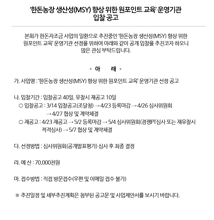 첨부파일 다운로드 (사업제안서)‘한돈농장 생산성(msy) 향상 위한 원포인트 교육’ 운영기관 입찰 공고.hwp