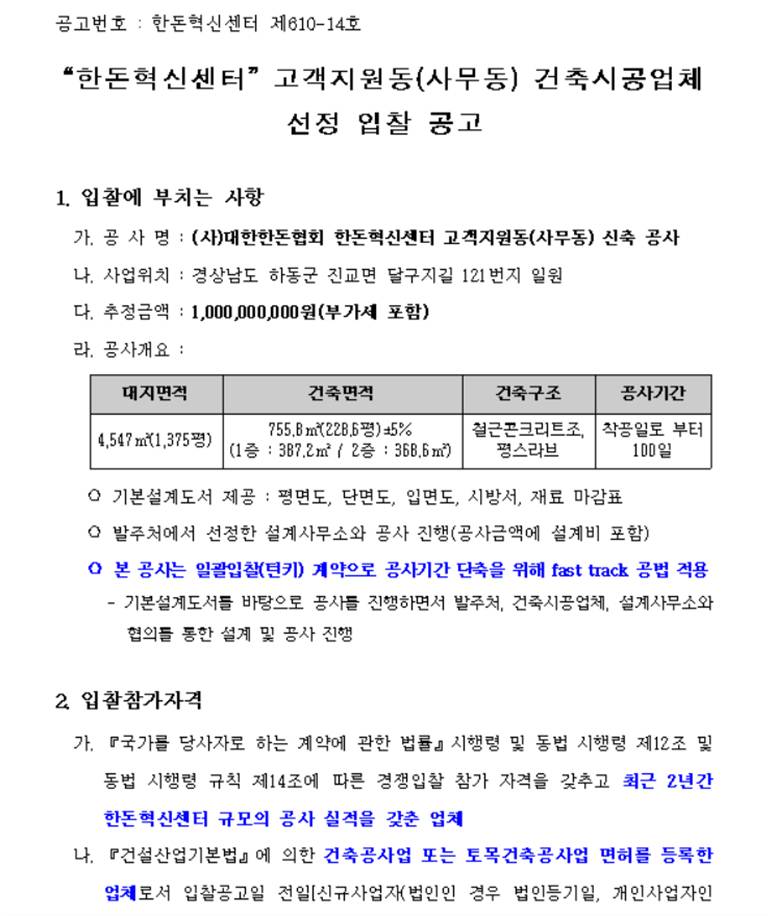 한돈혁신센터 고객지원동(사무동) 건축시공업체 선정 입찰공고