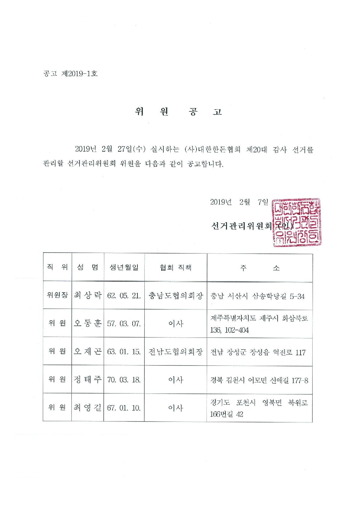 [공고] 제2019-1호 본회 제20대 감사 선거관리위원회 위원공고