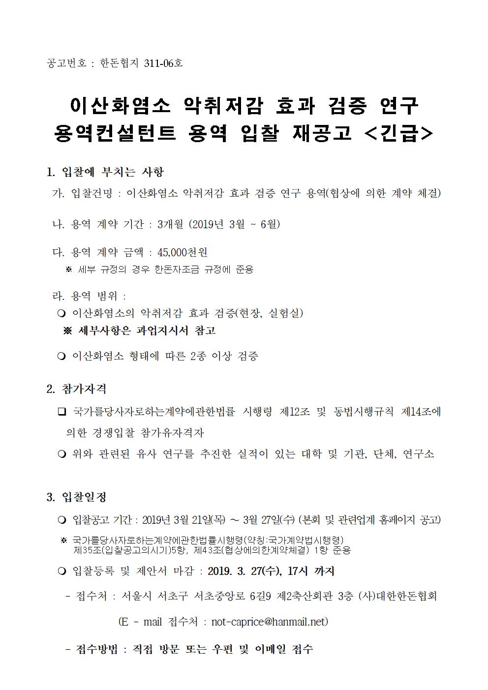 첨부파일 다운로드 311-06(재공고문) 이산화염소수 악취저감 효과검증 연구용역 추진 (2).pdf