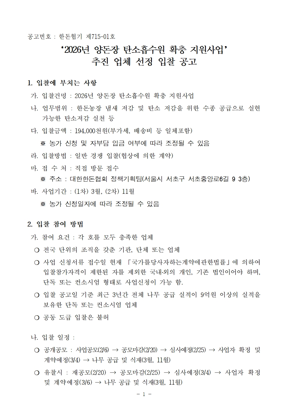 첨부파일 다운로드 715-01(공고문) 2026년 양돈장 탄소흡수원 확충 지원사업 업체 입찰.hwpx