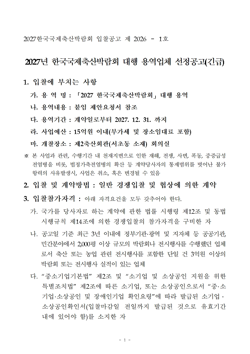 2027 한국국제축산박람회 대행업체 선정 입찰 공고(긴급)