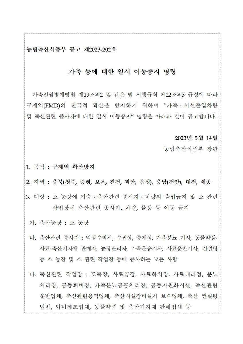 가축전염병 예방법 제19조의2 및 같은 법 시행규칙 제22조의3 규정에 따라 구제역(FMD)의 전국적 확산을 방지하기 위하여 "가축·시설출입차량 및 축산관련 종사자에 대한 일시 이동중지" 명령을 붙임과 같이 공고합니다.