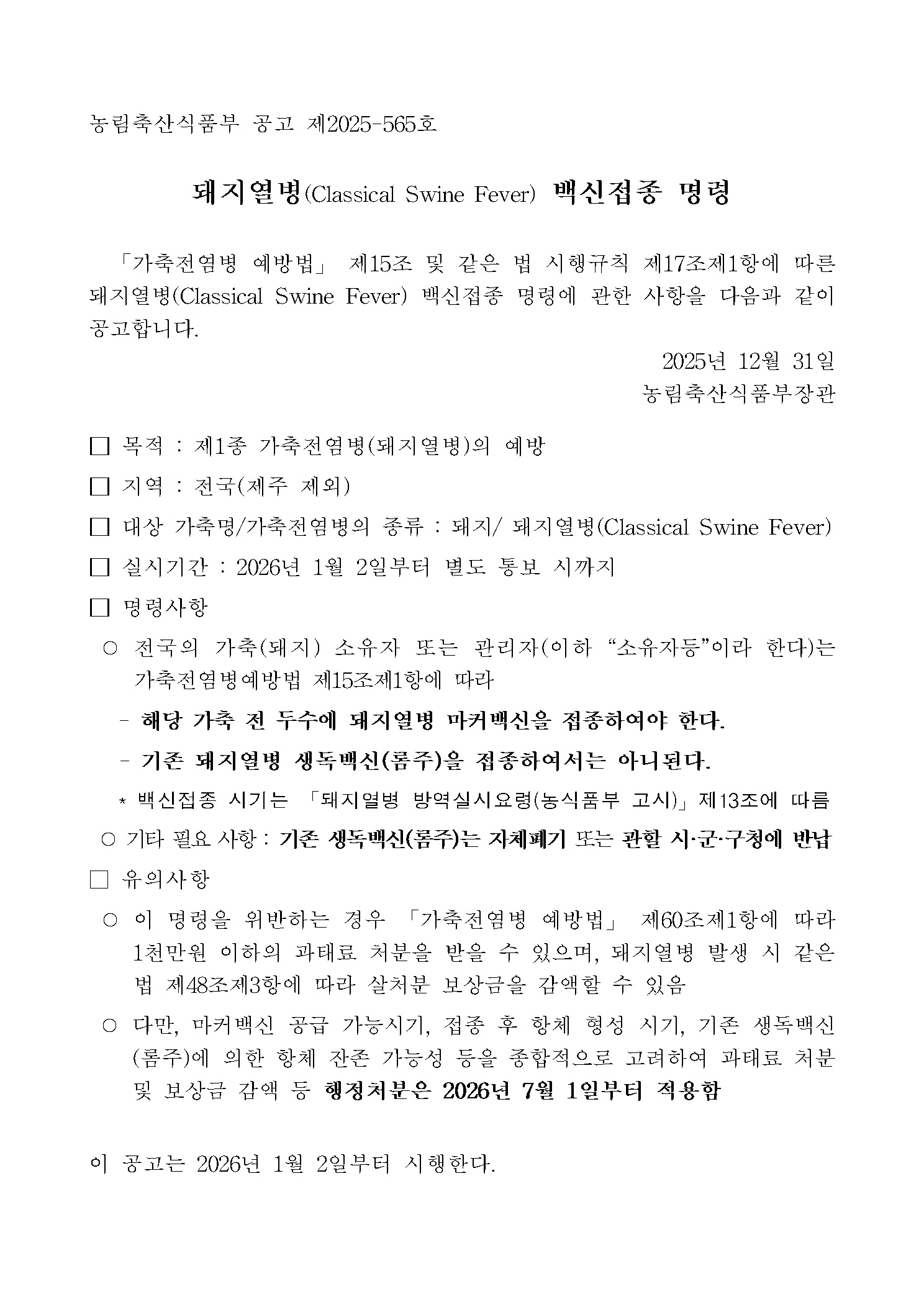 2026년 1월 2일부터 전국(제주 제외)의 모든 돼지에 대해 기존 생독백신(롬주) 접종을 중단하고, 마커백신 접종을 의무화하는 행정명령이 시행됩니다.