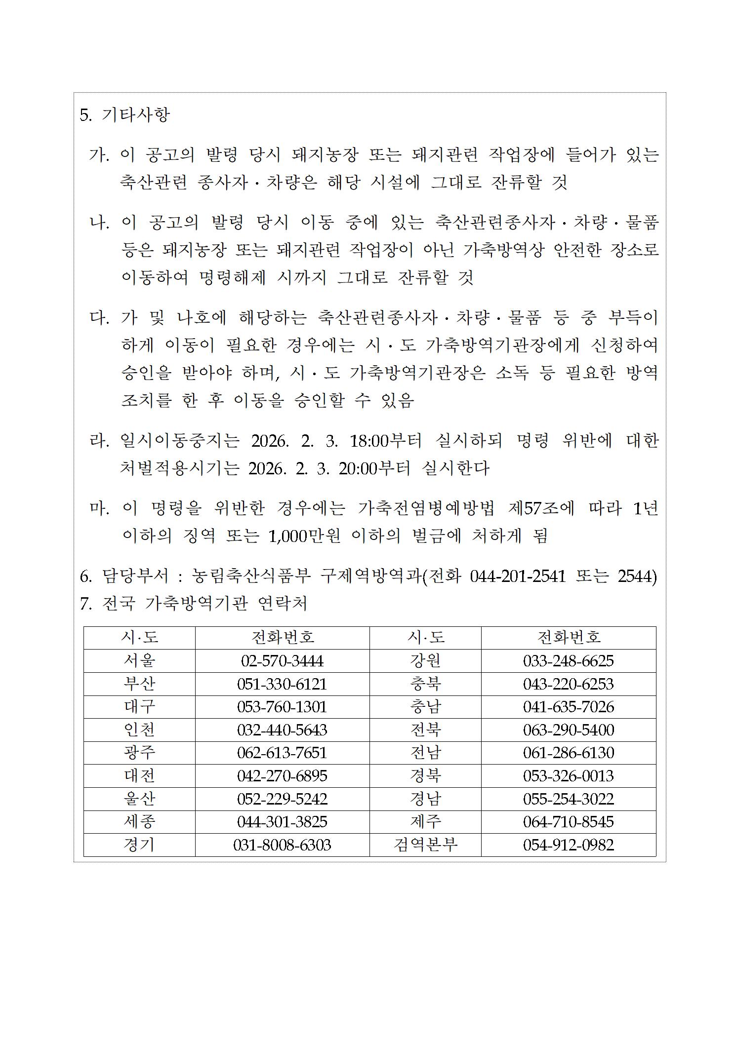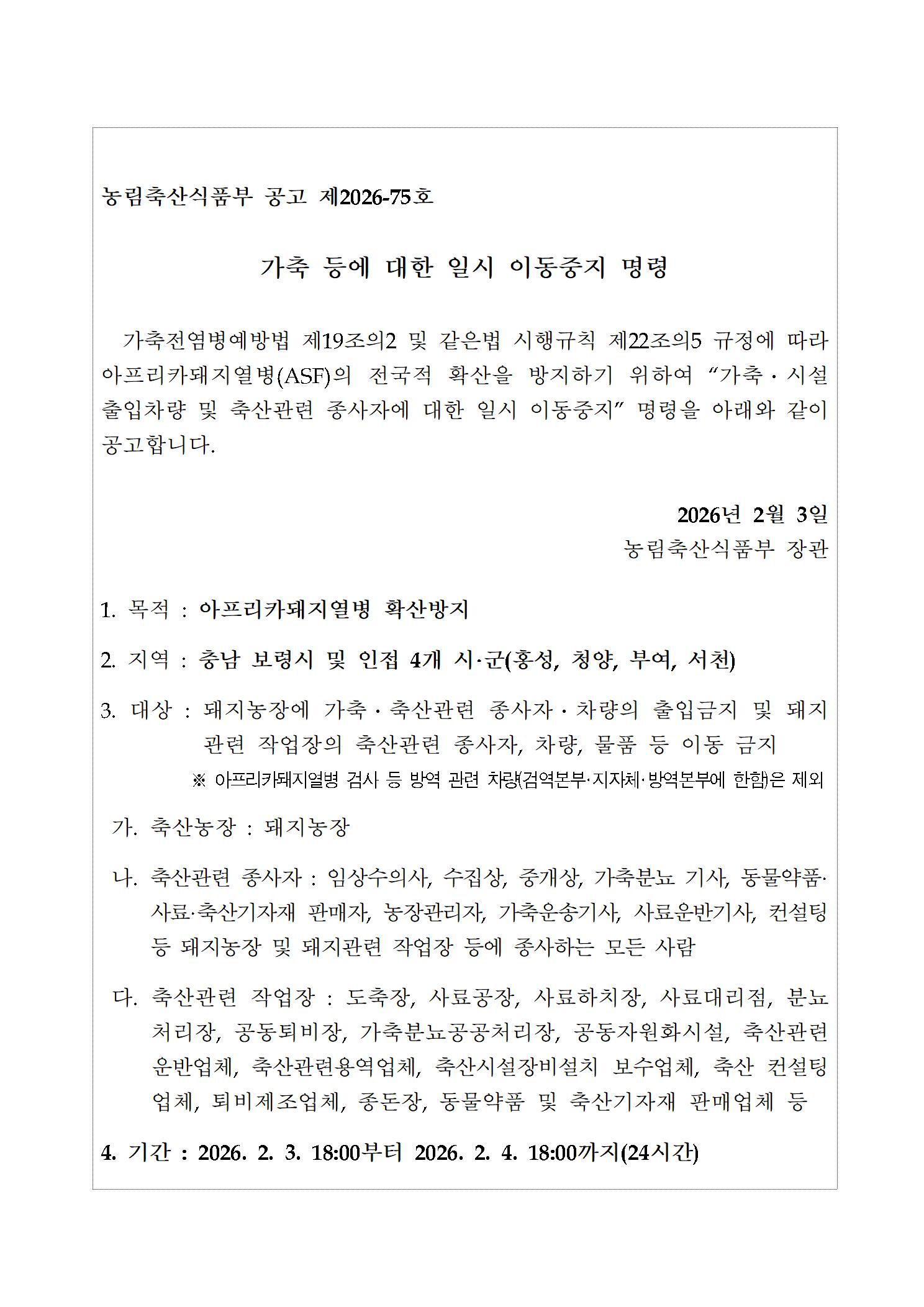 "가축·시설출입차량 및 축산관련 종사자에 대한 일시 이동중지" 명령을 붙임과 같이 안내합니다.