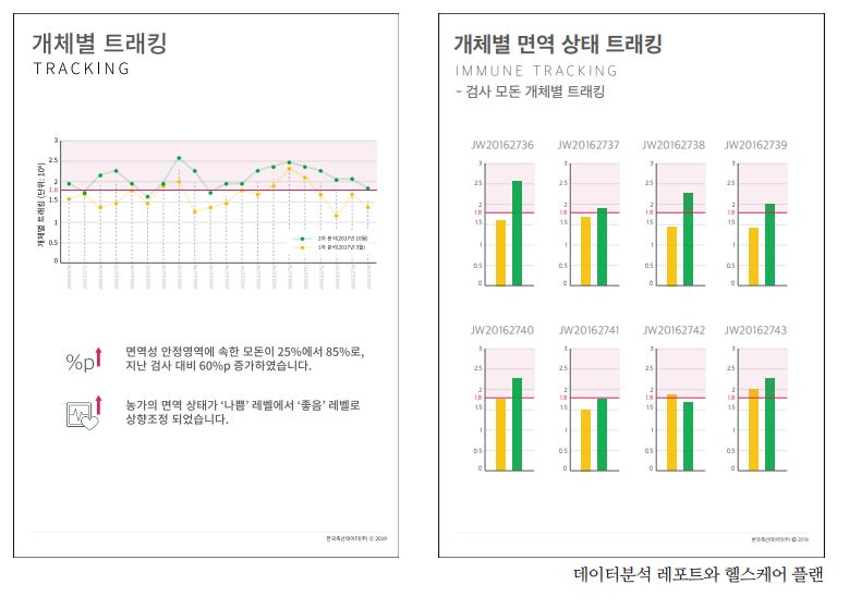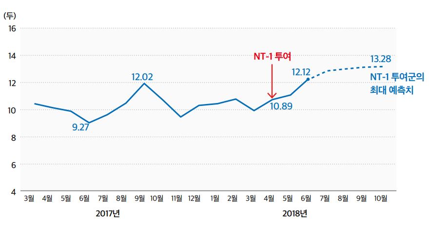 데이터 분석을 통한 정기 레포트와 컨설팅(옵션) NT-1 투여 농장에 대한 데이터 분석과 이를 시각화한 레포트를 농장에 제공합니다. 바이오 데이터와 사양관리 데이터를 모아 분석하고 시각화한 자료에 현재 농장의 상태와 예측, 개선 방향에 대한 수의사와 컨설팅까지 담아 농장에 주기적으로 보고 하고 있습니다.