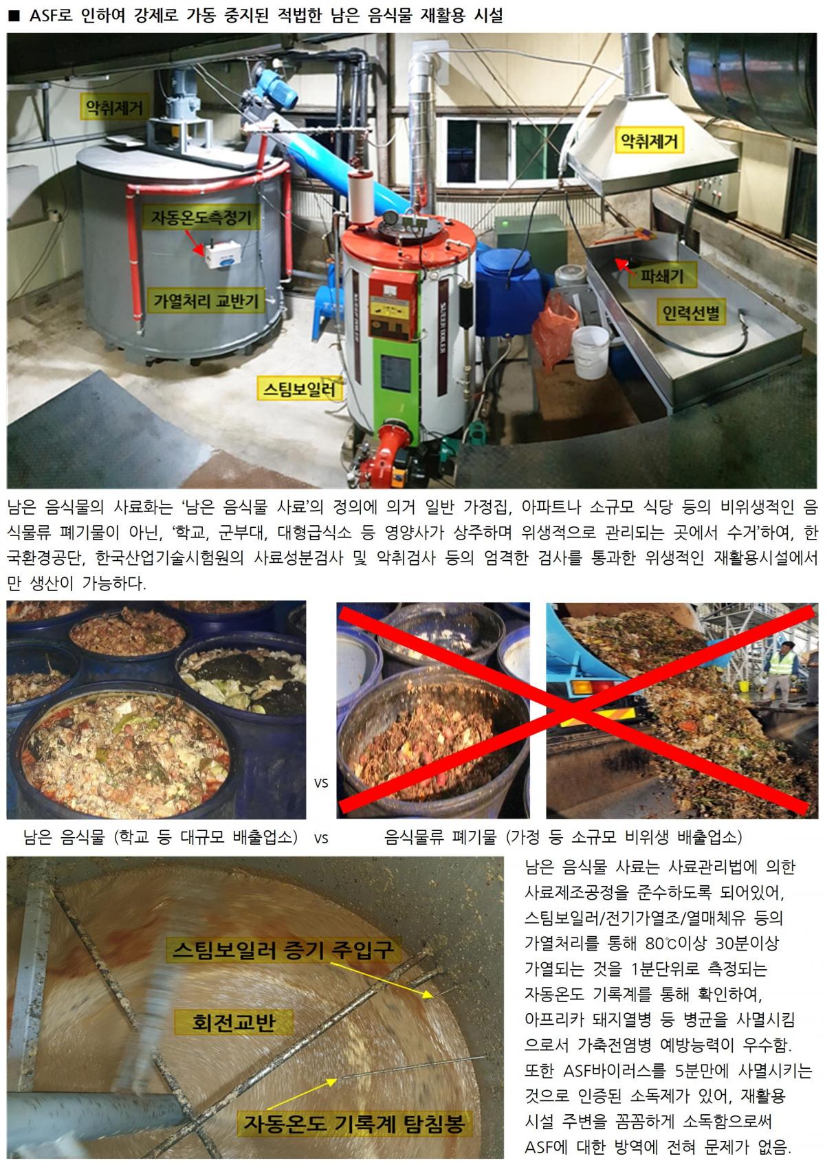우리 한돈협회 양돈인 여러분! 저는 전국음식물사료축산연합회 사무국장입니다. 또한, 부모님이 한돈협회 회원이시고, 저희 전사연의 회원분 중 95%가 한돈협회 회원인 양돈농가입니다. 저희가 먼저 한돈협회에 화해의 손을 내밉니다. 그동안 한돈협회에서는 잔반이 아프리카돼지열병의 주범이라고 하여 저희를 죽여야한다고 했지만, 실상은 그렇지 않다는게 이제 현실에서 증명되고 있지 않습니까? 더이상 같은 회원, 같은 양돈인들이 분열되어서는 안된다고 봅니다. 서로의 오해는 풀고, 화합해야 한다고 생각합니다. 경기북부 똥값 살처분에 농민들이 울면서 농림부를 찾아온답니다. 전국에 ASF 다 퍼질까봐 경기북부 살처분한다하니, 제발 좀 살려달라고 한답니다. 그런데 농림부에서는 찾아오는 그 분들에게 오히려 우리들 얘기를 한답니다. 지난 7월25일에 잔반농가들 다 죽일 때, 대를 위해서 소가 희생하라고들 하지않았냐구요. 그러니까 전국에 퍼져나갈지 모르니 경기도 농민들만 희생하라고 한답니다. 그걸보는 우리들이 고소해할까요? 아닙니다! 그렇게 우리를 죽이려고 했어도! 그래도! 우리도! 양돈농가입니다! 살처분으로 죽어나가는 돼지며, 억울한 농민들 바라보면 예전 우리들 모습을 보는것 같아서, 우리들도 눈에서 피눈물이 나오고, 가슴이 미어 터집니다! ASF 바이러스에도 이렇게 안전한 남은 음식물 사료가 있는데, 그냥 잔반 과 잔반사료(남은 음식물 사료)는 너무나도 다른데, 오히려 이것을 전 국민에게 알리고, 권장하고, 키워야 함에도 정부는 오히려 거꾸로 된 정책을 펼치고 있습니다. 음식물류 폐기물과 남은 음식물을 구분할 생각도 못하고, 투망 포획식 방역과 규제일변도의 정부 정책에 너무나도 통탄할 따름입니다. 우리국민들도, 우리 한돈협회 임원들도, 회원들 조차도, 잔반(남은 음식물)하면, 음식물쓰레기와 동일하게 인식되고 있습니다. 하지만 그것은 잔반에 대한 여러분들의 무관심으로 인한 오해와 편견입니다. 실상은 그렇지 않음에도 어찌된 일인지 부정적 프레임이 씌워져서는 지난 십여년간 국민들을 호도하고 있는 내용입니다. 또한 ‘사료값을 절약하기 위한 명목으로 돼지에게 음식물 쓰레기를 먹여서 처리함으로서 돈을 벌고, 돼지에게 신체적, 정신적으로 명백히 동물 학대 행위를 벌이고, 품질이 떨어지는 쓰레기 돼지를 생산한다고 오해들 하시고 있습니다. 그러나 저희들 합법적인 가열처리 잔반사료 급이농가들은 절대로 그렇지 않습니다. 이는 다수의 적법한 시설을 갖추지 않고 비위생적이고 불법처리가 자행되는 불법농장들과 우리들 소수의 합법적인 시설을 갖춘 가열처리 잔반사료 급이 양돈농가들을 똑같이 취급하는 잘못된 일반화의 논리입니다. 지난 7월 12일 국무총리 직속 국무조정실의 잔반사료 규제심의가 있었습니다. 심의위원들이 참석한 가운데 가열처리 잔반사료 급이 양돈농가들의 대표로 저희 전사연 회장, 부회장 그리고 소농가를 대표하는 고문까지 이렇게 3분이 참석하여 가축전염병이 올 때 잔반을 사료화 하는 것을 전면금지하는 내용으로 심의를 받았습니다. 당시 저희 전사연의 소농가를 대표하시는 고문님께서 심의위원들에게 이러한 말씀을 하셨습니다. [심의위원님, 자식이 있으십니까? (네) 그럼 그 자식에게 좋은 밥을 먹이겠습니까? 나쁜 밥을 먹이시겠습니까? (묵묵부답..) 우리같이 소농가라고해도 나라에서 시키는 대로 합법적인 시설을 갖추고 끓여서 사료로 만들어 먹이는 사람들에게 돼지는 자식같은 가축입니다. 내 자식들 죽으라고 상하고, 병균 들어간 거, 그런 거는 내가 죽어도 못 먹입니다. 눈뜨고 그 꼴은 못봅니다. 그리고 사실, 우리나라가 자원이 많은 나라입니까, 부족한 나라입니까? (묵묵부답..) 나는 내가 이렇게 좋은 남은 음식물로 사료를 만들어서 우리 자식들 먹이는 거 오히려 자랑스럽습니다. 내가 어려서 전쟁 통에 먹을 거 없고, 커가면서 나라가 어려울 때도 그 잔반, 먹다 남긴 거 끓여서 먹었던 사람입니다. 그런데 이제 우리나라가 조금 잘 살게 되었다고, 그때에 비하면 너무나도 좋은 이 상급의 음식들을 그냥 버린다는 게 나는 너무도 안타깝습니다. 우리는 법에서 하라는 대로 위생적으로 관리하고 영양사가 상주하면서 관리하는 학교나 군부대 같은데서만 그것도 좋은 밥들만 골라서 가져옵니다. 더러운 식당이나, 가정집에서 나오는 음식물 쓰레기는 거들떠도 안봅니다. 그리고 우리가 그거 가져오면 그거 불법이예요. 또, 합법적으로 시설도 다 갖추고, 매년 검사도 다 받고, 환경도 보호하고, 자원도 절약하고, 나라에도 애국하고 있다고 우리는 생각하는데, 도대체 우리가 뭘 잘못했다고, 이런 건강한 잔반사료를 먹이지 말라는 말입니까?] 라구요. 회원여러분, 늙은 양돈농민의 한탄에서 정말로 느껴지는 게 없으십니까? 우리나라는 자원이 부족한 국가입니다. 우리나라는 반드시 사료자급율을 높여서 식량주권을 지켜야합니다. 지난 IMF때 제2의 금모으기 운동으로 당시 용어로 ‘음식물 찌꺼기 사료화 운동’을 시작한 곳이 농림부와 환경부입니다. 우리의 식량주권을 지키기 위해서 ‘깨끗한 