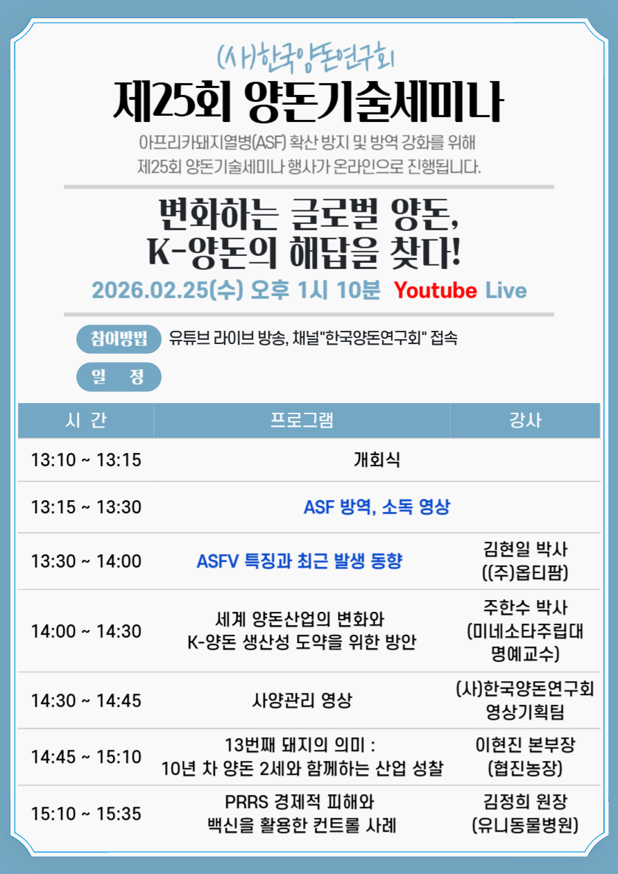 - 참여방법: 유튜브 라이브 방송, 채널 "한국양돈연구회" 접속