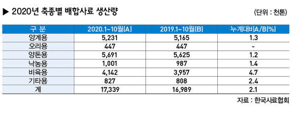 올해는 전반적인 가축 사육마릿수 증가로 배합사료 생산량이 전반적으로 증가한 것으로 나타났다. 그러나 배합사료 생산 증가율은 상반기 가파른 속도로 올라가다가 하반기에 들면서 증가폭이 점차 축소되는 경향을 보였다. 한국사료협회에 따르면 10월말까지 배합사료 생산량은 1722만9000톤으로 지난해 같은 기간과 비교할 때 약 2.1% 늘어난 것으로 조사됐다. 가장 많은 폭으로 증가한 것은 비육용 사료로 지난해부터 이어진 가임암소와 송아지 생산 증가로 인한 기록적인 사육마릿수 증가로 지난해 같은 기간보다 4.7% 늘어나며 전체적인 배합사료 생산량 증가에 견인차 역할을 했다. 양돈용 사료는 지난 7월까지 돼지고기 수입량이 지난해 동기 보다 28.4% 감소하고 돼지고기 가정소비 증가와 외식소비 감소 등이 돼지 사육에 영향을 미치면서 역대 최고치였던 지난해를 넘어서는 최대 생산량을 기록할 것으로 보인다. 양계는 같은 기간, 1.3%, 낙농 사료는 1.4% 늘어나며 1%대의 상승폭을 보였다. 올해 이 같은 배합사료 생산량 증가는 코로나19로 인한 국산 축산물 소비 증가로 송아지, 병아리, 자돈 등 어린 가축의 입식과 가임암소가 증가한데 따른 것으로 나타났다. 올해 홍수 피해 등이 있었지만 우려했던 폭염이 상대적으로 덜하면서 계절적 원인에 따른 가축 사육마리 수 증가도 완만한 증가세에 힘을 보탠 것으로 나타났다. 이 같은 생산량 증가에도 배합사료회사들의 영업이익률은 지난해에 이어 여전히 1%를 기록할 것으로 전망되고 있다. 사료업계의 한 관계자는 “올해 사육마릿수 증가로 배합사료 생산량이 늘어난 것은 사실이지만 여전한 과당경쟁으로 사료업체들의 영업이익률은 1~2%대에 머무를 것으로 보인다”며 “특히 내년도에는 국제곡물가격의 상승이 예상되고 있어 배합사료업체들의 어려움이 가중될 것으로 예상된다”고 우려의 목소리를 나타냈다. # 동물약품 예년 수준 성장 올해 동물약품은 국내시장은 코로나19 발생에 따른 축산업 경기 전반의 어려움에도 예년 수준의 성장은 가능할 것으로 예상되고 있다. 한국동물약품협회에 따르면 세계 동물약품 시장규모는 2008년 191억 달러에서 연평균 6% 이상의 비교적 높은 성장률을 보여 2018년에는 340억 달러(약 40조 원, 1달러=1183원 기준) 수준에 이르렀다. 우리나라 시장규모는 지난해 총 1조2040억 원 수준으로 이 중 국내생산이 8331억 원, 수입이 3907억 원이다. 국내생산 8331억 원 중에는 국내에서 판매되는 내수용이 4832억 원, 수출이 3499억 원이다. 수출액은 2012년 1584억 원(내수의 27%)에서 2017년 3064억 원으로 2012~2017년 평균 14.1%의 높은 성장률을 보여 왔지만 아쉽게도 2018년 수출액이 3197억 원(내수의 40%)으로 4% 성장에 그쳤고, 지난해는 9% 성장했으나 수출액이 3499억 원(내수의 41%)에 머물렀다. 정병곤 한국동물약품협회 부회장은 “현재 국내 내수시장이 세계시장의 약 2% 수준밖에 점유하지 못하는 점을 감안하면 동물약품 산업발전을 위해선 내년에도 세계시장으로의 수출 확대는 선택이 아닌 필수라고 생각된다”고 밝혔다. # 축산기자재 어려웠던 한 해 지난해 발생한 ASF(아프리카돼지열병)에 이어 올해 코로나19 여파까지 겹치면서 축산기자재산업은 매우 어려웠던 한 해였다. 비대면 체제의 가속화로 인해 상대적으로 매출액이 적거나 규모가 작은 영세 축산기자재업체들의 영업에 많은 어려움이 있었던 한 해였지만, ICT(정보통신기술) 관련 축산기자재를 개발·생산하는 업체에게는 코로나19로 인해 더욱 주목을 받는 해였다. 최근 몇 년간 ICT 제품의 개발과 보급이 확산되면서 관련 시장은 꾸준한 성장세를 보이고 있다. 여기에 더해 지난달 15일 정부가 스마트 축사용 ICT 기자재 중 감지기(센서) 19종의 국가표준을 제정했다고 밝히면서 국산 축산기자재의 호환성 향상과 품질 향상, 업체별 기술 경쟁력 제고에 많은 효과가 발생할 것으로 기대되고 있다. 소재광 한국축산환경시설기계협회 부장은 “농림축산식품부가 2018년 12월 스마트팜 분야 최초로 온실에 사용한 센서·구동기 22종에 대한 국가표준을 제정한 데 이어 지난달 스마트 축사에 사용하는 외부센서 7종, 내부센서 8종, 안전센서 4종의 국가표준을 제정했다”며 “이번에 제정한 국가표준은 축사 내·외부의 환경·안전정보를 측정하는 센서의 전기·기계적 연결규격으로 축사 외·내부 환경과 안전 상태 등을 측정하는 센서의 연결선 수, 색깔, 순서, 끝부분 모양 등을 표준화하면서 관련 기자재 생산 업체 또한 관련 기술 개발을 활발히 진행할 것으로 예상하고 있다”고 말했다. 현재 관련 시장은 국내 시장이 포화 상태이기 때문에 축산기자재 업체들은 저마다 살아남기 위한 생존 전략을 갖추는 게 필수적이다. 소 부장은 “ICT 관련 기자재뿐만 아니라 우리나라나 중국을 비롯한 환경문제에 대한 관심이 증가하는 나라가 점차 증가하고 있기 때문에 축산분뇨와 축산부산물(폐사축)처리를 위한 기자재 수출에 특히 많은 관심을 가질 필요가 있다”고 말했다. # 한우, 사육마릿수 최대 불구 가격 높아 올해 초 전문가들의 예상대로 한우 사육마릿수는 320만 마리를 기록했다. 다만 한우 가격