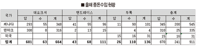 올해 수입된 종돈을 원산지별로 살펴보면 캐나다산이 545두로 가장 많았고, 덴마크산 335, 미국산 31두의 순이었다.