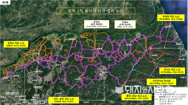 ▲ 멧돼지 차단울타리 설치 현황(12.28 기준)@환경부 또한, 최근 감염지역인 인제, 가평, 포천, 춘천 일대에 수색 인력을 집중 투입하여 추가 폐사체 수색과 함께 경기도 및 강원도 등 지자체 및 민간 수렵인들과의 유기적인 협력 하에 포획대책을 적극 추진해 나갑니다. 중수본은 “야생멧돼지 ASF이 확산 추세이므로, 양돈농장에서는 울타리 등 방역시설을 완비하고, 장화 갈아신기, 생석회 도포, 입산과 영농활동 금지 등 기본 방역수칙을 철저히 이행해 줄 것’‘을 당부하였습니다. 한편 29일 기준 국내 ASF의 누적 확진은 924건(사육돼지 16, 야생멧돼지 908)입니다. 이날 화천과 인제, 포천 등에서 8건의 감염멧돼지가 추가 발견되었습니다. [출처: 돼지와사람 2020. 12. 30.] |