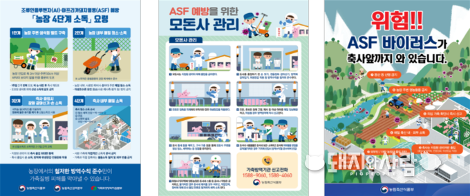 ▲ 양돈농장 ASF 차단방역 수칙 홍보물@농식품부 아울러 전국 양돈농장에 대해 4단계 소독실시요령, 기본 방역수칙, 모돈사 방역수칙 등에 대한 홍보를 강화하고, 특히, 경기·강원 남부 및 충청권 그리고 전국 10개 돼지 밀집사육 시·군(홍성·보령·당진·천안·예산·이천·안성·정읍·김제·무안)에 대해서는 자발적 방역 강화 조치 이행과 농가 소독 강화에 나섭니다. 멧돼지 방역 대책 발생지점 주요 멧돼지 이동경로에 윤형철조망을 긴급 설치하고, 기존 울타리의 훼손, 출입문 닫힘 상태 등에 대해 집중 점검·보강을 실시합니다.