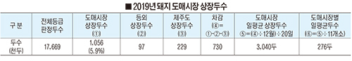 한국육류유통수출협회 분석에 따르면 2019년 기준으로 전국 도매시장(제주 제외) 수는 총 11개다. 이 도매시장에 상장되는 총 돼지물량은 1056천두다. 전체 상장두수 17669천두 가운데 5.9%. 등외와 제주도 상장두수를 빼면 4.1%로 뚝 떨어진다.