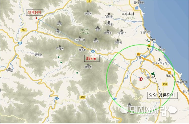 강원도 양양 ASF 발생지점 및 방역대(10km) 내 농가 위치@강원도