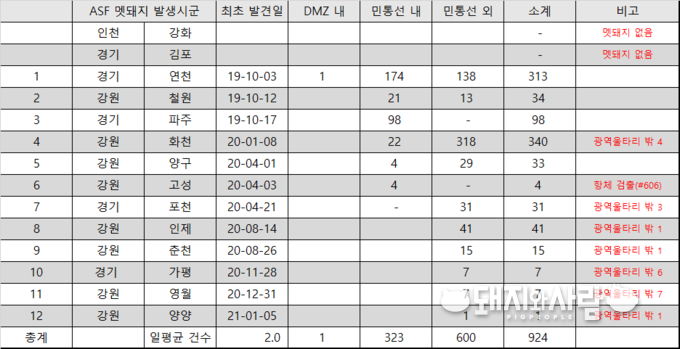 시군별 야생멧돼지 ASF 발생현황@돼지와사람 편집