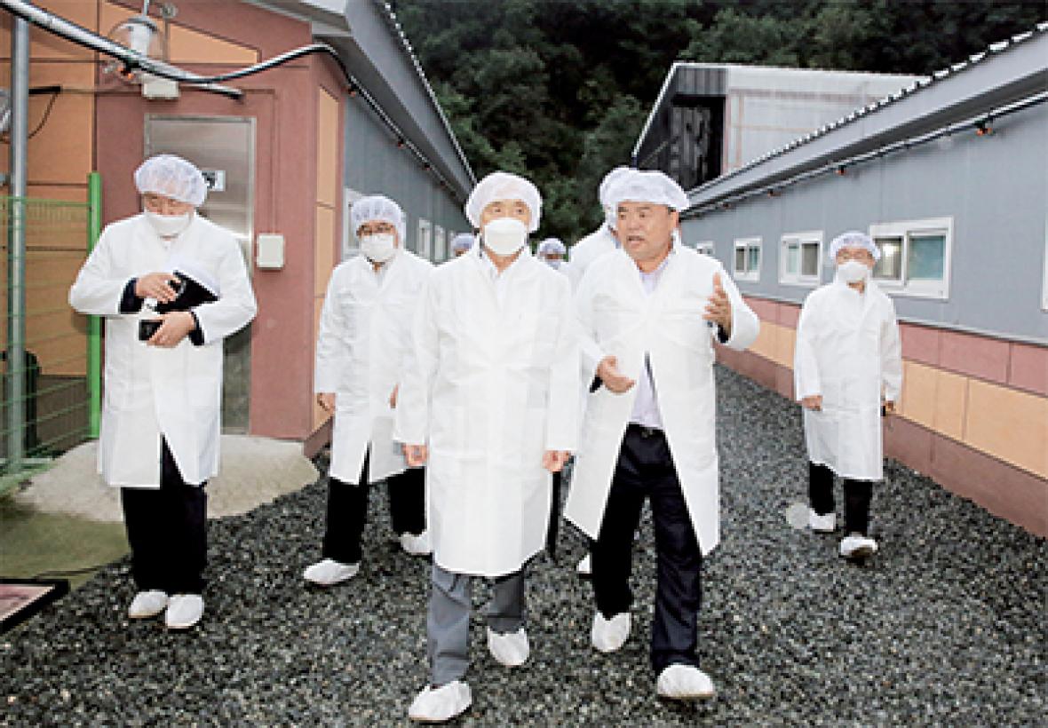 농특위 정현찬 위원장<앞줄 사진 왼쪽>이 해지음을 찾아 다양한 축산환경개선 사례를 시찰하고 있다.