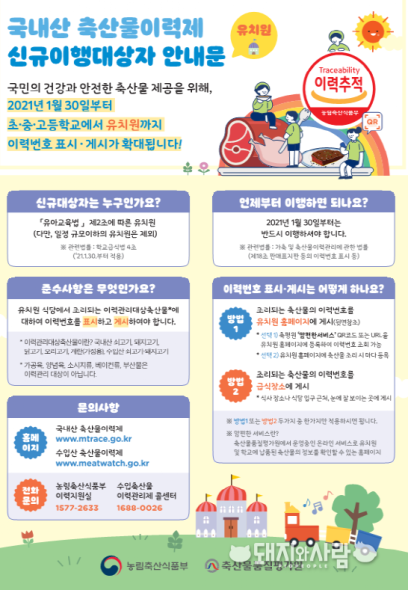 130일부터 축산물 이력번호 표시게시 의무가 기존 초··고등학교에서 유치원까지 확대됩니다. 위생과 영양관리 지원을 목적으로 '학교급식법'이 개정되면서 어린이급식에 대한 관리·감독이 강화된 것입니다.