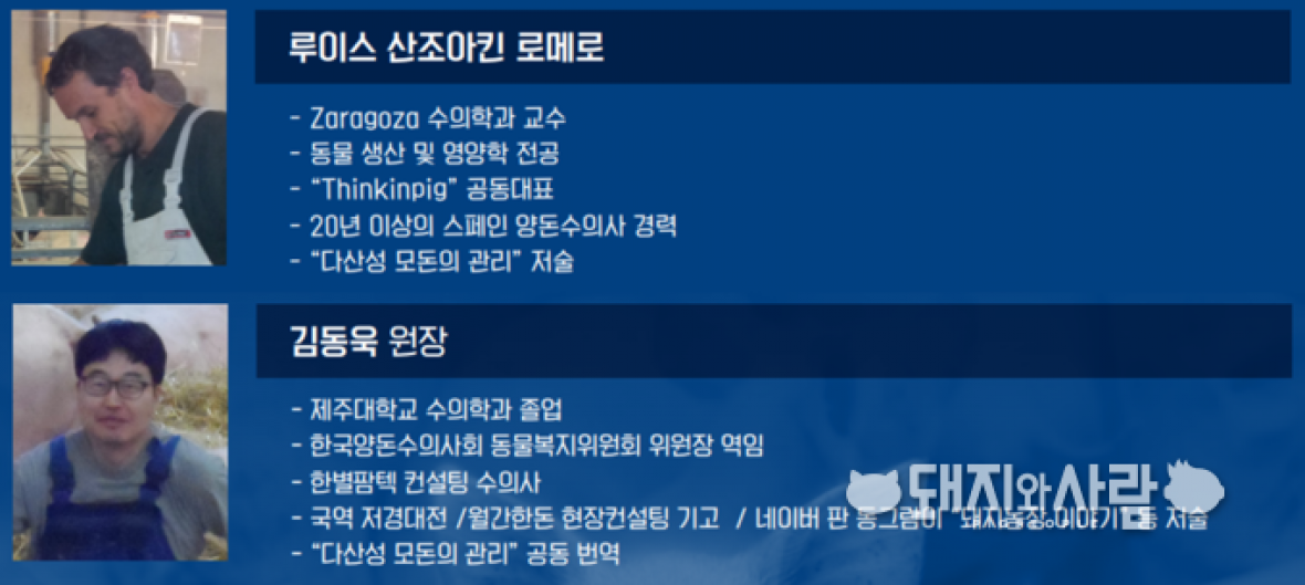 강사로 '다산성 모돈의 관리'를 집필한 루이스 산조아킨 로메로 수의사(Zaragoza 수의대 교수, Thinkinpig 공동대표)와 한별팜텍 김동욱 원장이 나섭니다.