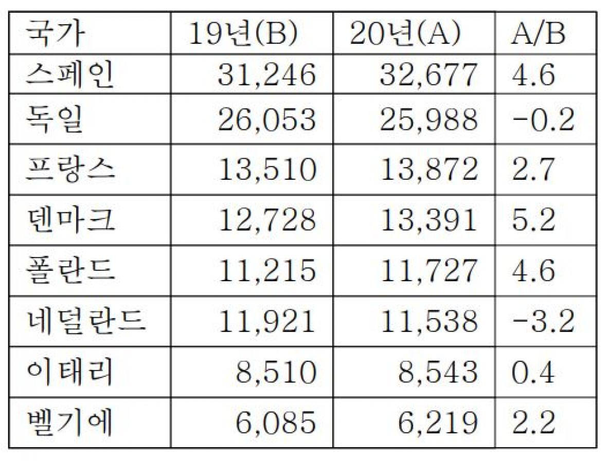 독일의 경우 전체 돼지 두수는 비육돈 출하 지연으로 전년 수준에 머물렀지만 번식돈 두수는 일년전보다 5.3% 가량 감소했으며 최대 사육국가인 스페인도 다소 줄고 네덜란드는 무려 11.5% 감소했다. 또한 동유럽 국가들을 중심으로 ASF가 지속 발생하고 있어 이 역시도 EU 양돈산업에 위협 요인이 되고 있다.
