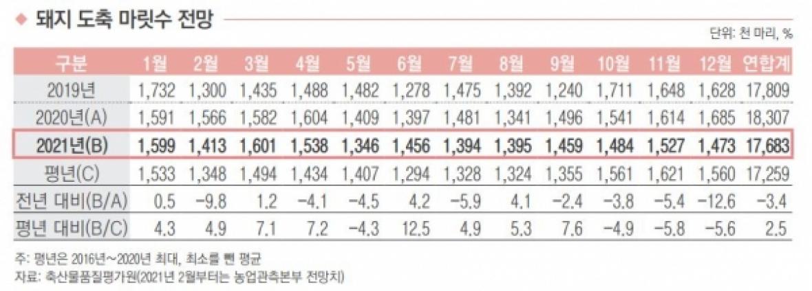 최근 농촌경제연구원은 3월 양돈관측을 통해 이달 평균 돼지도매가격이 3800~4100원으로 지난해 동월(3915), 평년(418) 대비 하락할 수 있다고 전망했다. 전년 동월보다 각각 25.4%, 8.6% 상승했던 1~2월과 비교하면 상승세가 꺾이는 것은 물론이고 하락세로 돌아설 가능성을 더 높게 본 것이다. 농경연은 이와 관련, 코로나 확산 상황 변화에 따른 소비 심리, 생활형편 변화 등 가격 변동 요인이 잠재해 있다고 덧붙였다.
