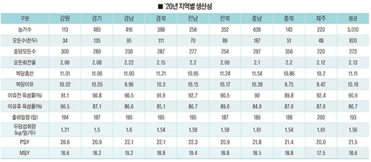지난해 PSY와 MSY 모두 전남지역이 최고를 기록했다. 전남은 PSY가 평균 22.3두에 달했다. 복당 총산자수는 11두를 넘지 못했지만 92.7%에 달하는 압도적인 이유전육성률을 보이며 복당 이유두수가 10.15두를 기록했고 모돈회전율(2.2)도 높았다.