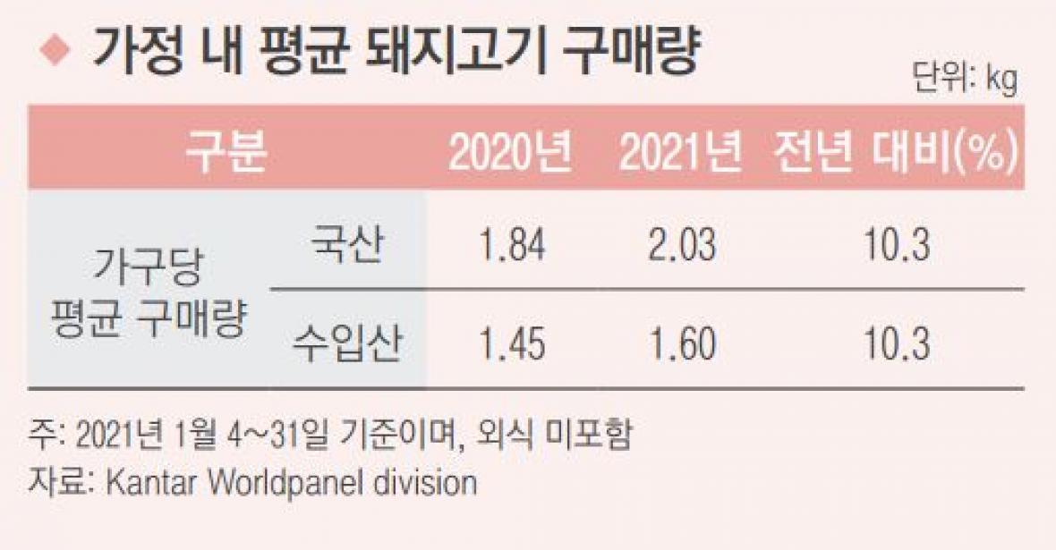 코로나 19 거리두기로 새해 들어서도 가정 내 돼지고기 소비 증가세가 이어졌다. 그런데 한돈에 코로나 소비 효과가 집중됐던 지난해와 달리 수입산도 동시에 는 것으로 조사됐다.