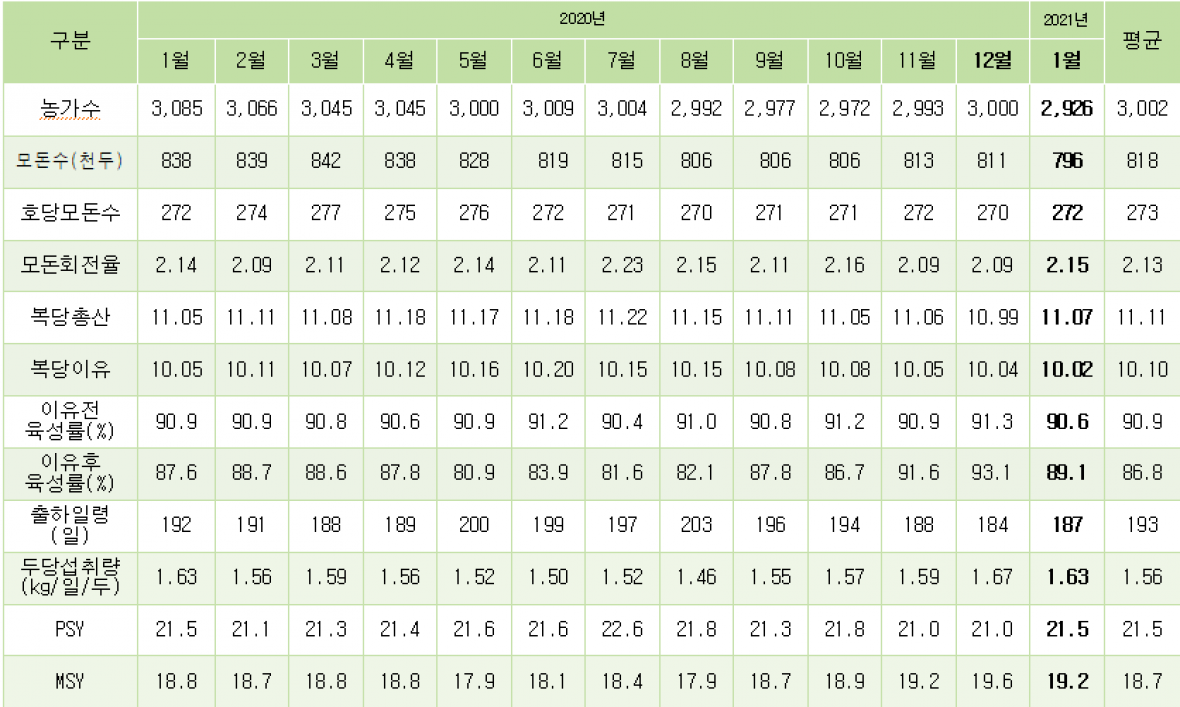 한돈협회가 운영 중인 한돈전산관리시스템 한돈팜스 1월 보고서에 따르면 PSY=21.5MSY=19.2두로 나타났다. 특히 MSY의 경우 지난 지난해 11월 이후 3개월 연속 19두 이상을 기록하면서 올해도 작년(평균 MSY 18.6) 못지 않은 생산 성적이 기대되고 있다.