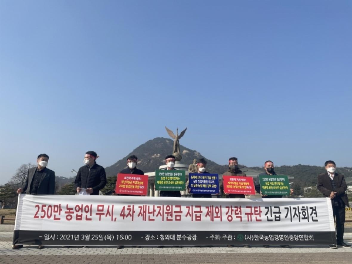 이에 한국농업경영인중앙연합회는 지난 25일 기자회견 개최를 통해 국회 농림축산삭품해양수산위원회에서 전체 농가에 대해 100만원의 재난지원금을 지급하기로 합의하였음에도 불구하고, 이러한 내용이 전혀 반영되지 않았다며 이는 250만 농업인을 무시하는 처사라고 성토했다.