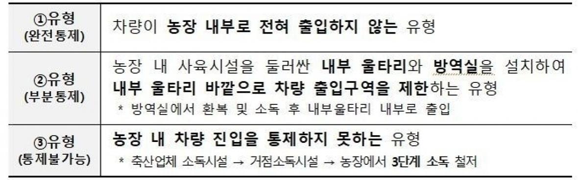 농장 내 차량 출입 통제 유형(3유형은 사실상 허용되지 않음)@농식품부