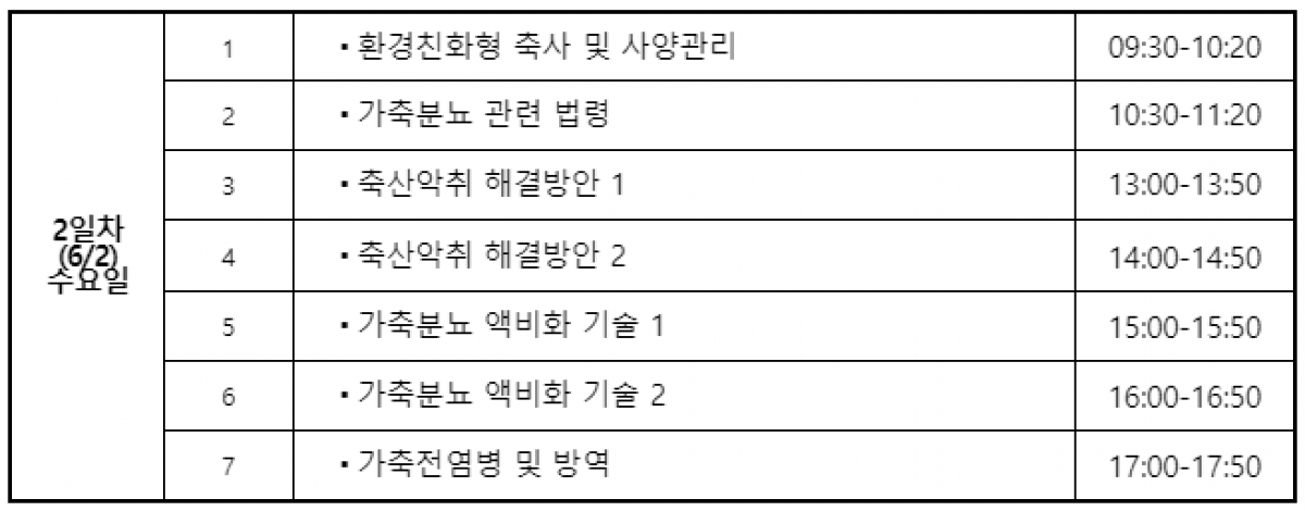 이번 양성교육은 코로나19 확산방지를 위해 기존 대면교육 방식이 아닌 비대면 온라인교육 방식으로 3일간 진행됩니다. 특히 교육과목 중 악취저감’, ‘·액비화 기술관련 과목의 비중을 대폭 늘렸으며, ‘축산환경 개선 컨설팅과목을 신설하였습니다.