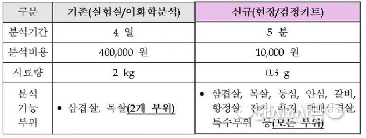 기존에는 돼지고기 원산지 판별을 위해서는 1건당 실험실 내에서의 이화학 분석기간 4, 분석비용 40만 원, 시료량 2kg이 소요되었습니다. 그런데, 이번에 개발된 검정키트는 비용이 1만 원으로 단속현장에서 콩 한 알 크기의 돼지고기 시료만 있으면 검사가 가능합니다.