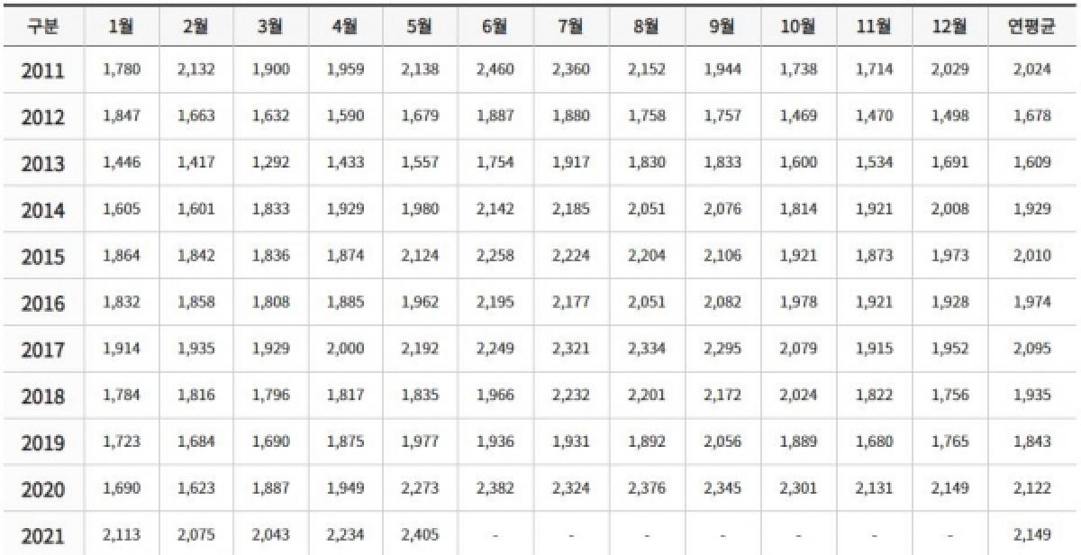 최근 10년간 월별 한돈 삼겹 소비자 가격 현황(출처 : 한국농수산식품유통공사)