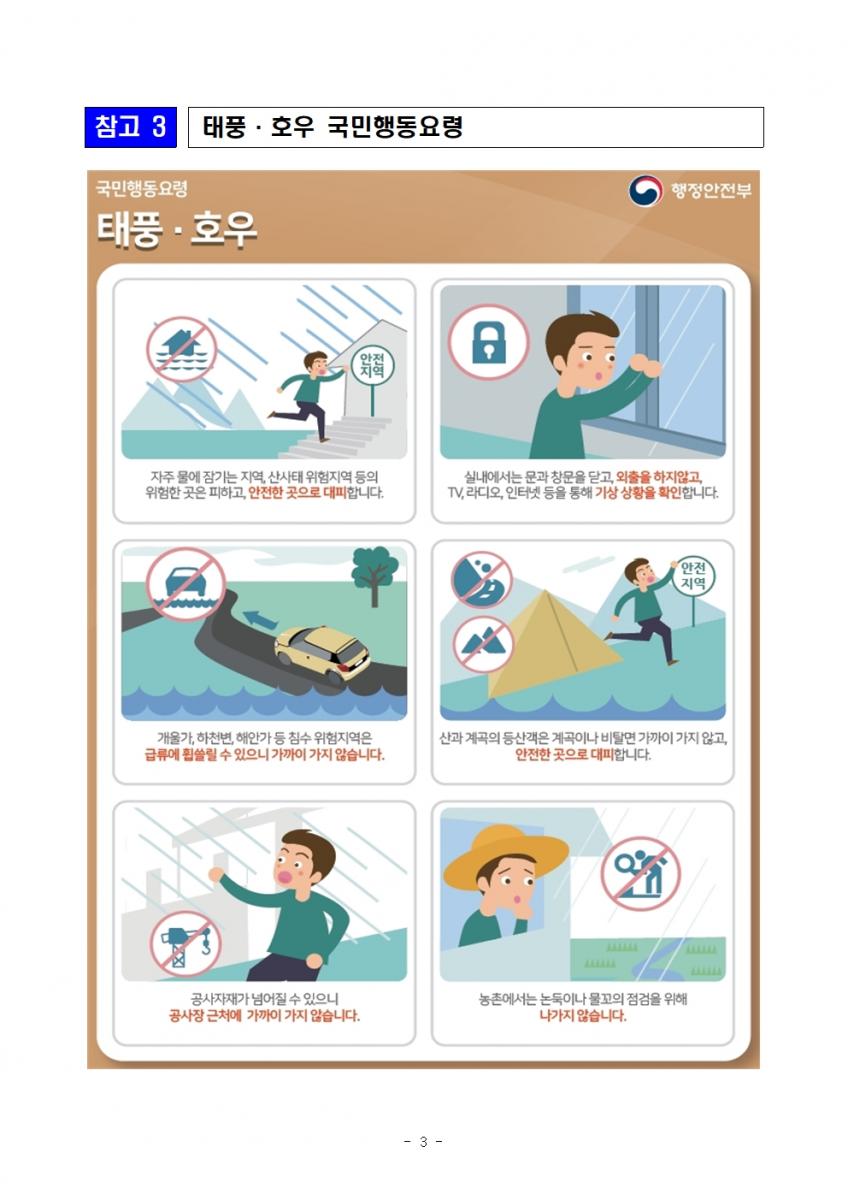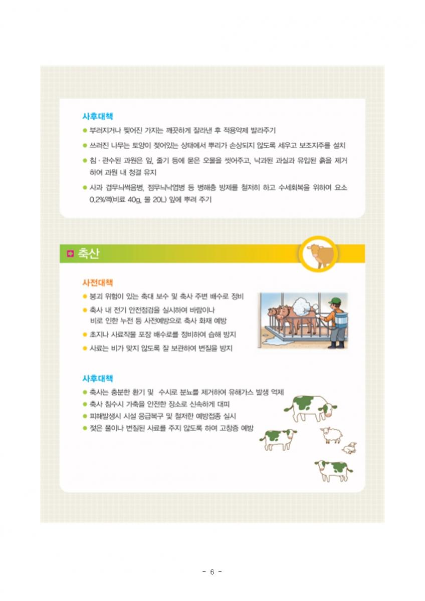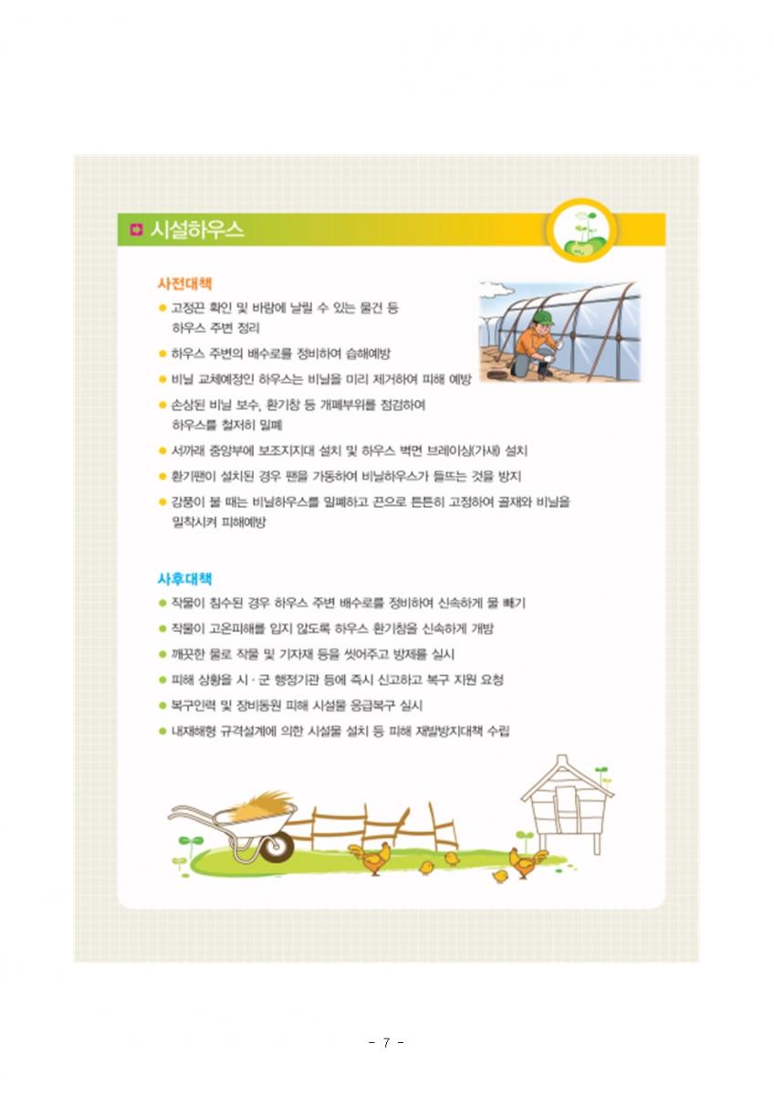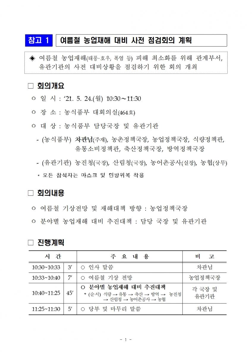 - 농업재해 대응기관 분야별 피해예방 대책 사전점검 실시 - << 주 요 내 용 >> ◇ (회의개요) 5. 24일(월) 농식품부는 여름철 재해에 대비하여 모든 농업재해 대응 조직이 모여 각 분야별 피해예방 대책을 사전점검 * 차관주재, 농식품부(식량국, 유통국, 축산국, 방역국), 농진청, 산림청, 농어촌공사, 농협 참석 ◇ (주요내용) 본격 장마시작 이전인 6.10일까지 재해대비 상황을 중점 점검·보완하고, 본격 여름재해대책상황대응 준비 ○ (사전점검·보완) 저수지·배수로 등 기반시설 점검, 응급복구 장비 점검, 비상 연락체계 정비 등 기관별 재해대책 점검 및 보완(4.24~6.9) ○ (재해대응) 여름철 재해대책 상황실 운영, 24시간 상황관리, 피해 발생시 신속한 응급복구 및 기술지원 등 본격 재해대응(6.10~10.15) ◇ (농업인 당부사항) 인명피해 방지, 재산피해 최소화를 위해 농업용시설 주변 배수로 관리 등 보완 및 재난시 국민행동요령 준수해 줄것을 당부 << 세 부 내 용 >>