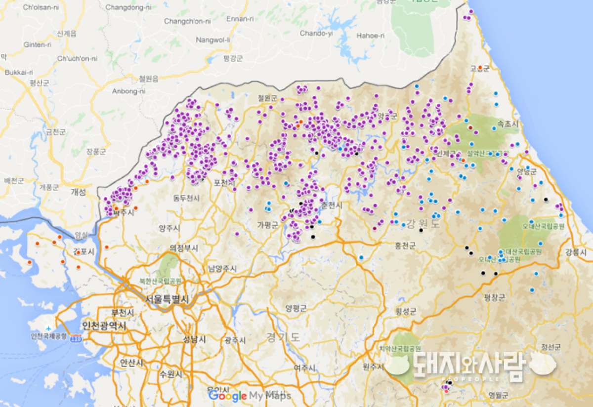 국내 ASF 발생지도(파란색 8월 신규 양성 멧돼지 발견지점)@구글지도 편집 1
