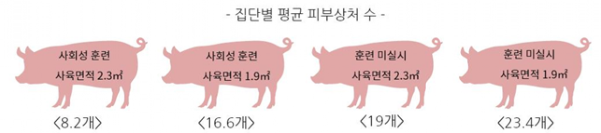 연구 결과 사회성 훈련 여부에 따라 훈련을 한 임신돈은 훈련을 하지 않은 임신돈에 비해 피부상처가 41.5% 적었습니다.