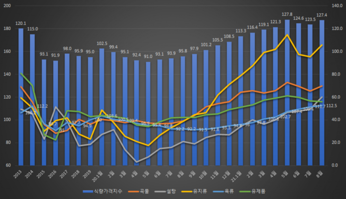 유지류는 전월보다 6.7% 상승한 165.7포인트를 기록했습니다(전년 동월 대비 67.9% 상승). 유제품은 전월보다 0.6% 하락한 116.0포인트를 나타냈습니다(전년 동월 대비 13.6% 상승).