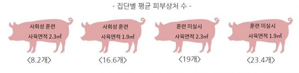 농촌진흥청은 사회성 훈련 여부에 따라 훈련을 한 임신돼지는 훈련을 하지 않은 돼지에 비해 피부상처가 41.5% 적었다고 분석했다.