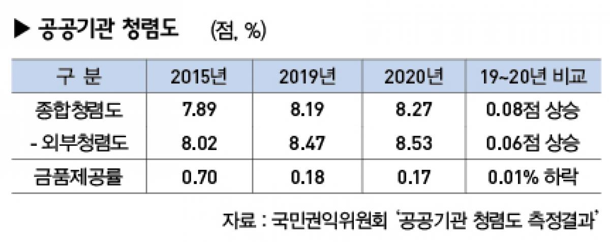 국민권익위원회의 공공기관 청렴도 조사결과에 따르면 추석 농축산물 선물가액을 일시 상향한 지난해 종합청렴도는 8.27점으로 2019년의 8.19점 대비 0.08점 상승한 것으로 나타났다. 하부지표 중 금품제공률은 20190.18%에서 20200.17%0.01% 포인트가 낮아진 것으로 나타났다.