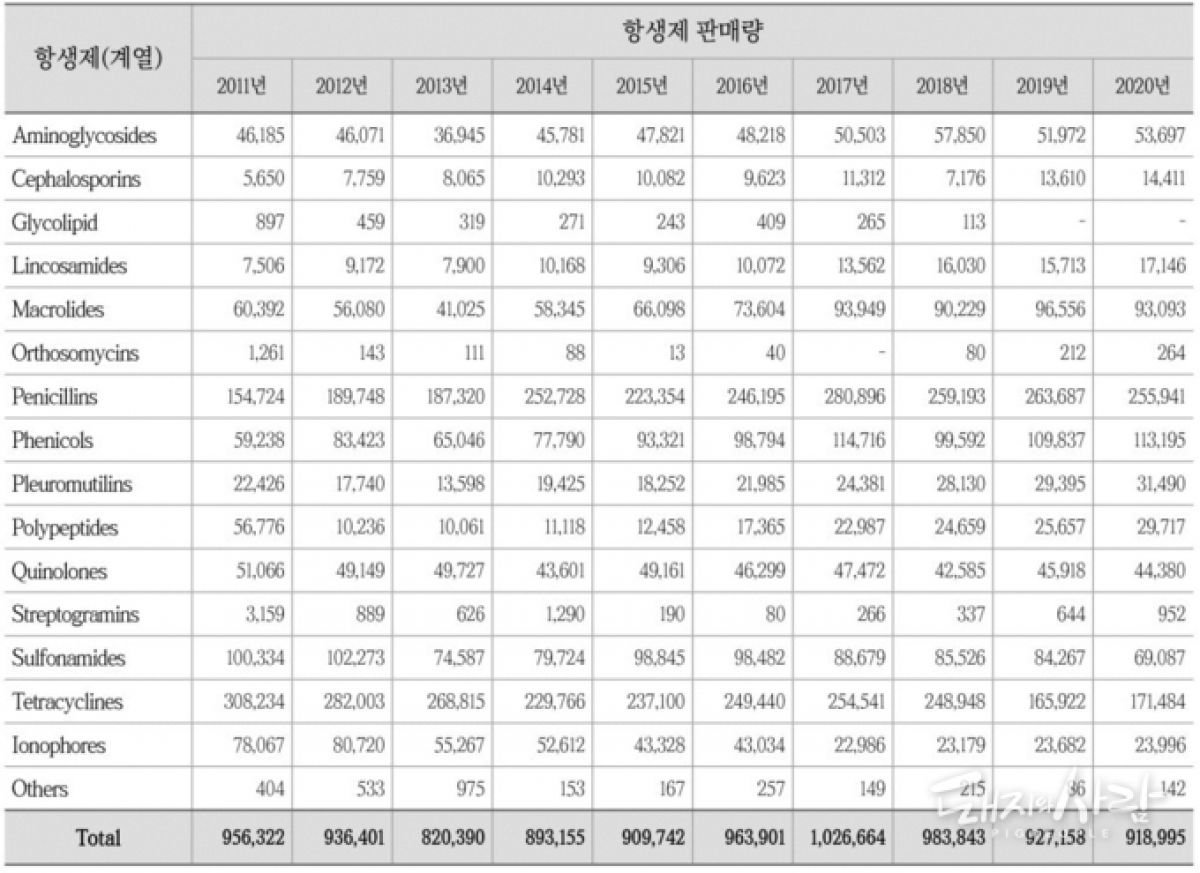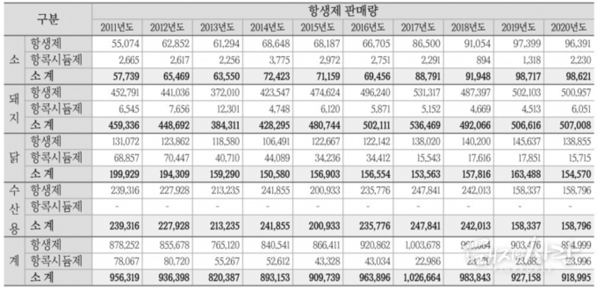 이같은 사실은 농림축산검역본부(본부장 박봉균, 이하 검역본부’)와 식품의약품안전처(처장 김강립, 이하 식약처’)가 최근 발간한 ‘2020년도 국가 항생제 사용 및 내성 모니터링(동물·축산물)’ 보고서를 통해 확인되었습니다.