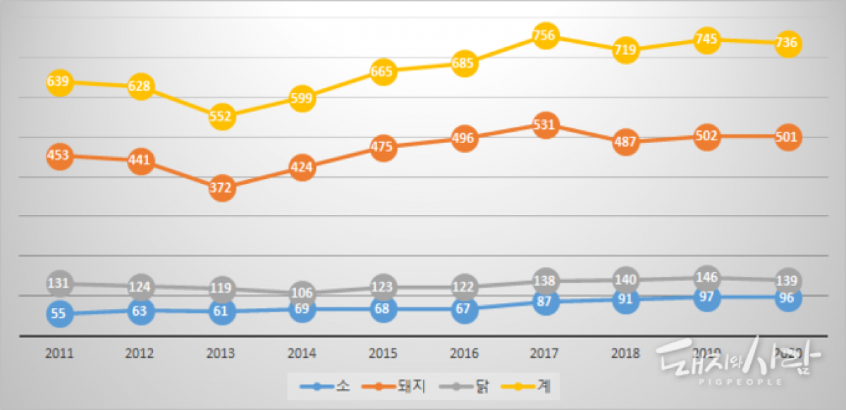 연도별 축종별 항생제 판매량(단위 kg)@2020년도 국가 항생제 사용 및 내성 모니터링 편집