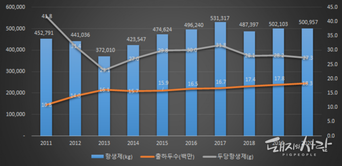 해당 보고서에 따르면 지난해 돼지 관련 항생제 판매량은 50957kg입니다. 이는 전년 502,103kg보다 미세하게나마 감소한 수준입니다(0.2%). 여기에 전체 돼지 출하두수를 반영하면 돼지 두당 항생제 판매량이 계산되는데 지난해는 27.3g으로 전년 28.2g보다 3.0%(0.8g) 줄어든 것으로 분석되었습니다(출하두수 '2018.3백만, '1917.8백만, 검역본부).