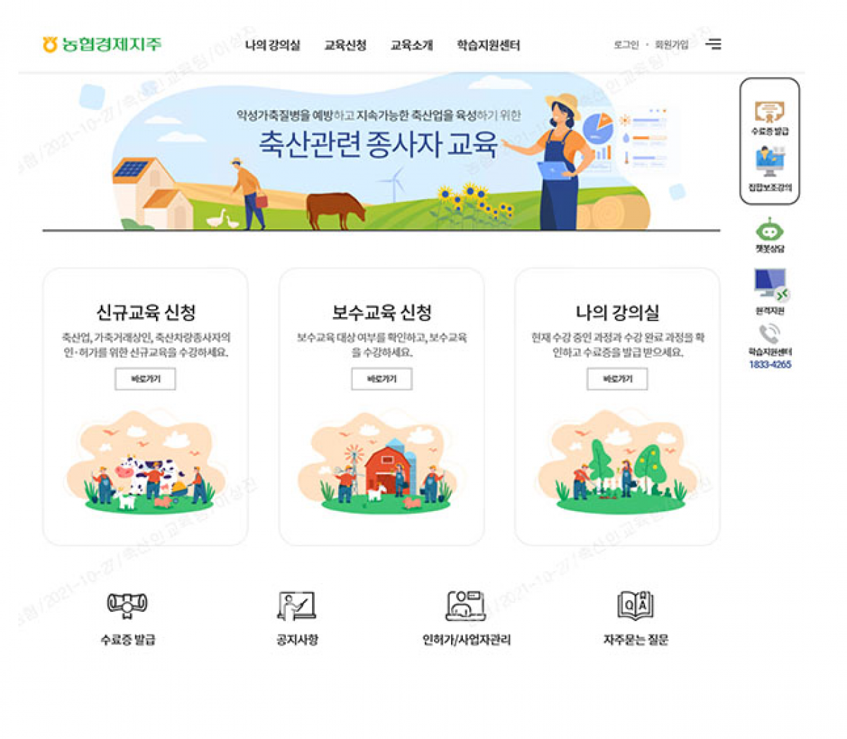 농식품부는 코로나19 발생으로 집합교육이 어려워짐에 따라 교육총괄기관인 농협 축산경제와 함께 전체 교육과정을 온라인화 하기 위해 기존 교육시스템을 전면 개편했다. 교육내용도 축종별로 세분화하고, 고령축산농가의 교육참여 편의 등을 추가했다.